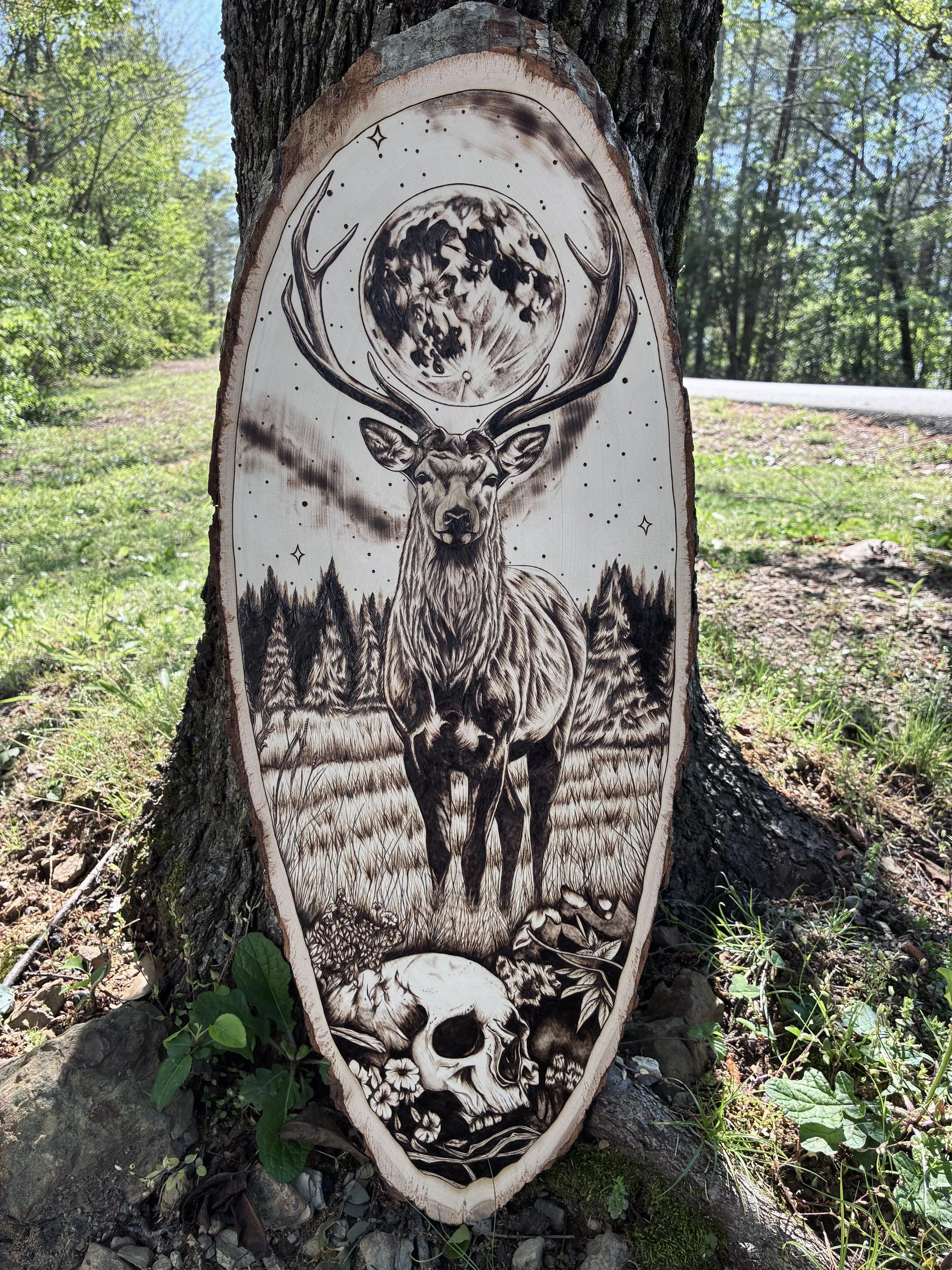 From the flowing cloak to the ritualistic symbols and skeletal motifs, the piece embodies the divine contrast at the core of Sleep Token — beauty in darkness, reverence in ruin. Finished on live-edge wood, it feels both sacred and raw, a tribute to the band’s mysterious essence.